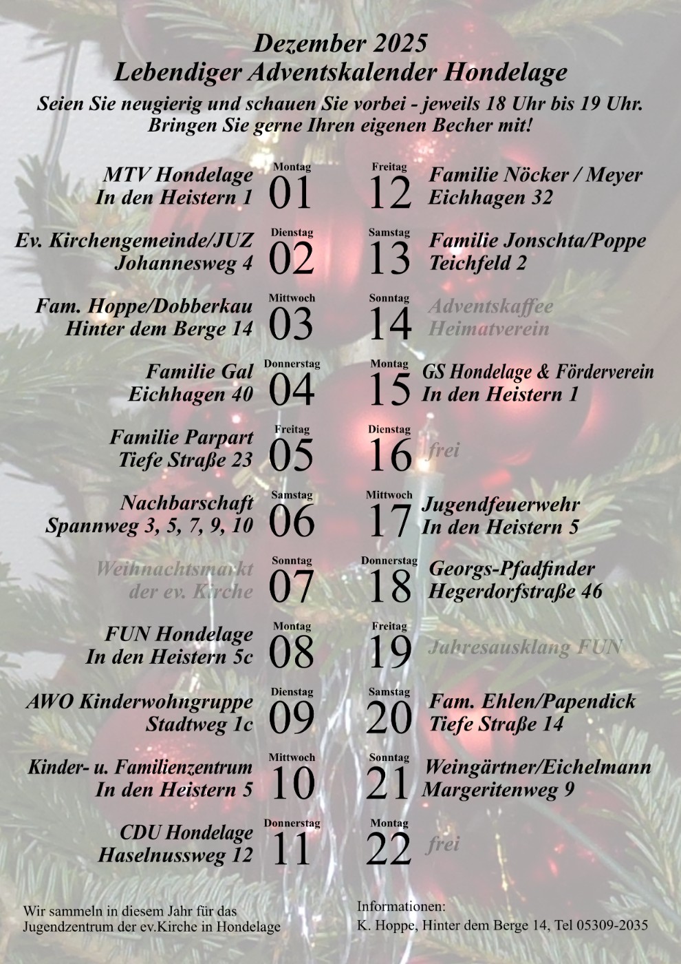 Bei dem geselligen Zusammensein wird es zwischen 18:00 und 19:00 Uhr eine Kleinigkeit zu Esssen geben und auch für Punsch und Glühwein ist gesorgt. In dieser Stunde sammeln wir Spenden für die das Jugendzentrum der ev. Kirche Hondelage.