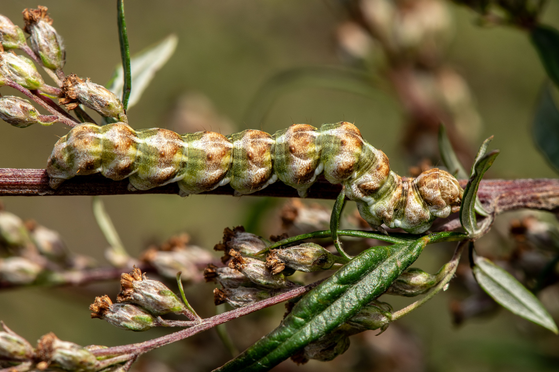 Mit etwas Glück und guten Augen kann man auf den Pflanzen des Beifuß die gut getarnte Raupe vom Beifuß-Mönch entdecken. Sie ist ein Musterbeispiel für Mimese.