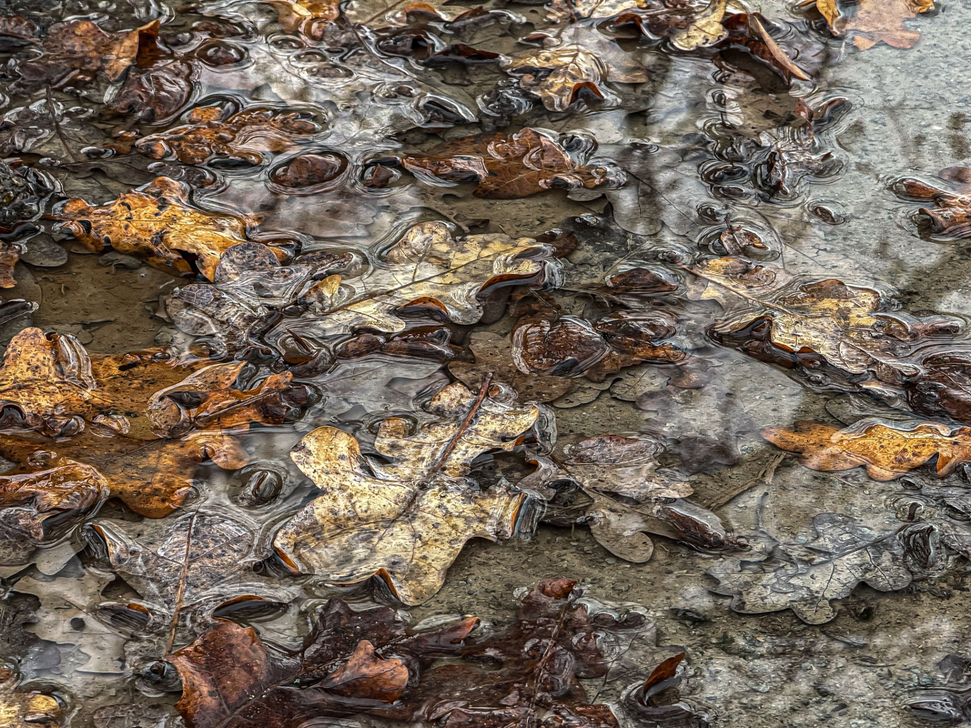 Bunte Blätter schwimmen in einer Pfütze auf der Straße