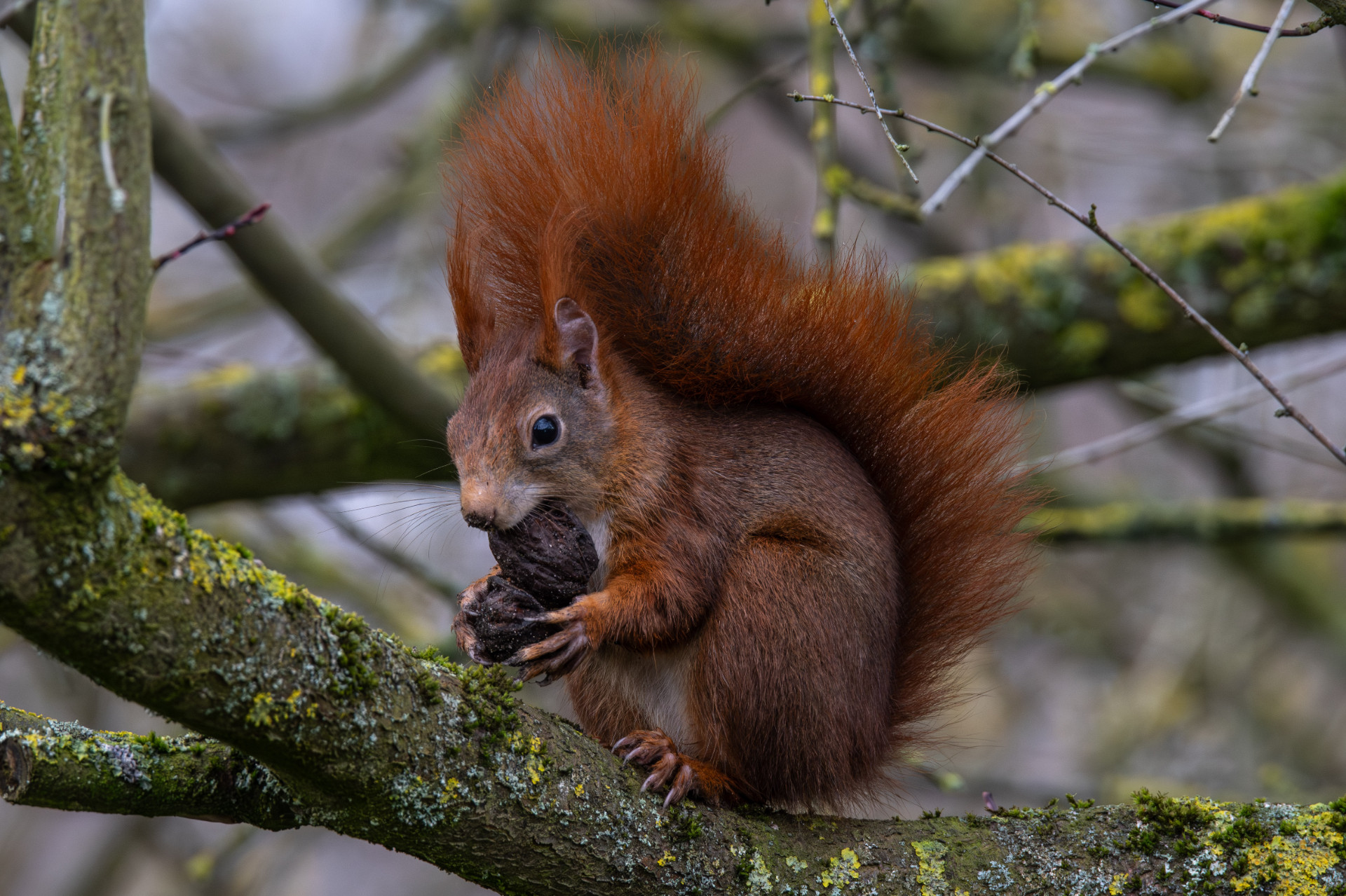 Ein Eichhörnchen hat eine Walnuss, die es als Wintervorrat im Gartenboden versteckt hatte, wiedergefunden und versorgt sich nun genüsslich in luftiger Höhe.