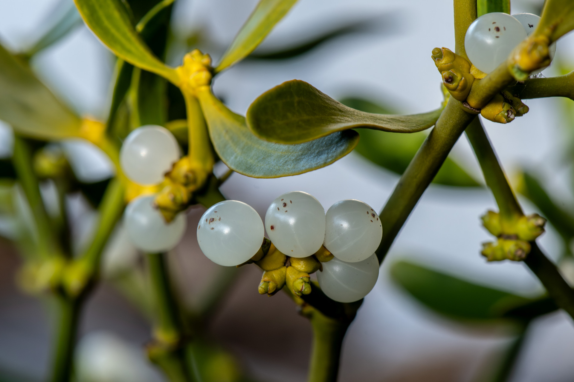 Zu Weihnachten tragen die Mistelbüsche ihre charakteristischen weißen Beeren. Weit vor anderen Pflanzen blühen sie schön im Februar und März. Das immergrüne Gewächs ist ein Halbschmarotzer, benötigt also für die Nährstoffversorgung einen Baum als Wirtspflanze.