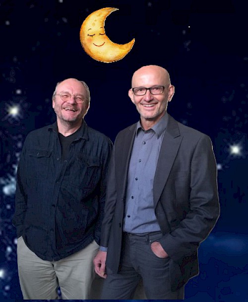 Géza Gál (Klavier, Trompete), Axel Uhde (Gesang, Gitarre) und ein Überraschungsgast laden das Publikum zu einer unterhaltsamen Reise zum Mond ein. Mit Wort und Musik gehen sie Fragen nach wie: „Gibt es eine Schnittmenge zwischen Beethoven, Sting und Gus Backus?“ oder „Haben Sie schon einmal den Mann im Mond gesehen?“