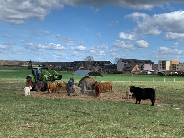 Wasserbüffel und Schottische Hochlandrinder sind Rinderarten, die besonders gut für die ganzjährige Freilandhaltung geeignet sind. Der Tierbestand der zwei Gruppen ist abhängig von der Größe und Qualität der Weideflächen. Jährlich werden einige Kälber geboren.